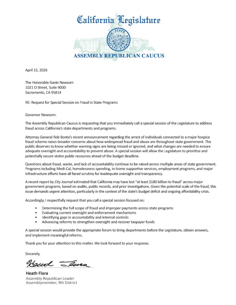LettersRequest for Special Session on Fraud in State ProgramsApril 17, 2026Read MoreRequest for Special Session on Fraud in State Programs